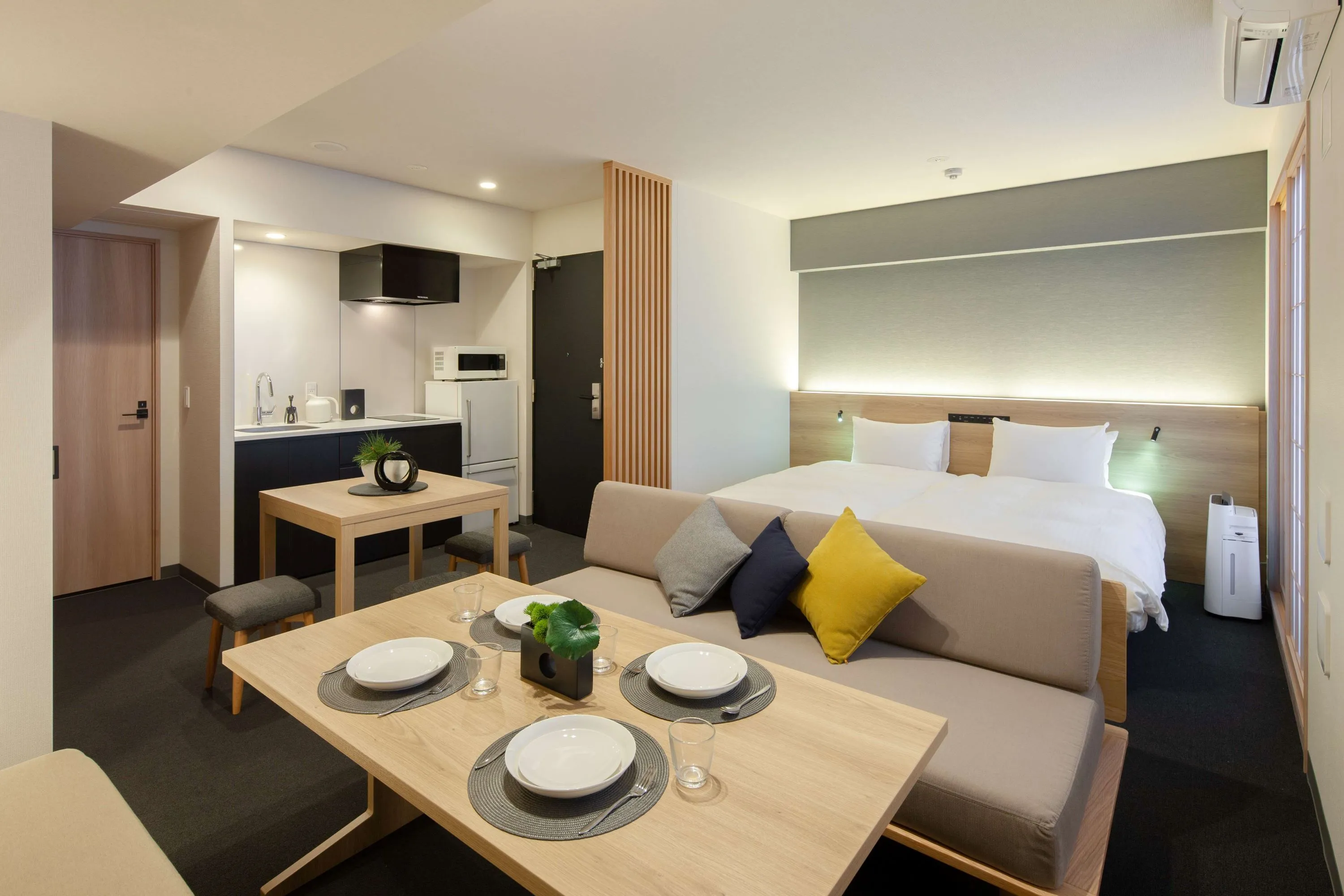 【サービス内容】コスモイニシアグループのコスモスホテルマネジメントが運営する、アパートメントホテル「MIMARU」は、キッチン、リビング・ダイニングスペース付きの約40m2からの広い客室を備え、“みんなで泊まる”を楽しむアパートメントホテルです。