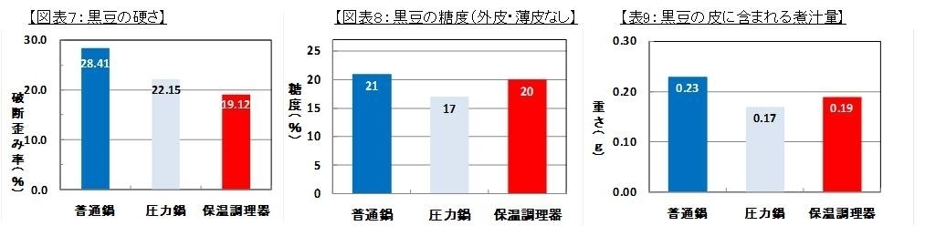 さらに黒豆の皮の硬さを比較したところ、圧力鍋が最も軟らかく仕上がりますが、歯で豆を噛んだ時に豆がどれだけ変形したかを表す「破断歪み率」でみると、保温調理器が一番軟らかく、食感は保温調理器が他の調理法よりも、かなり軟らかいことがわかりました【図表7】。