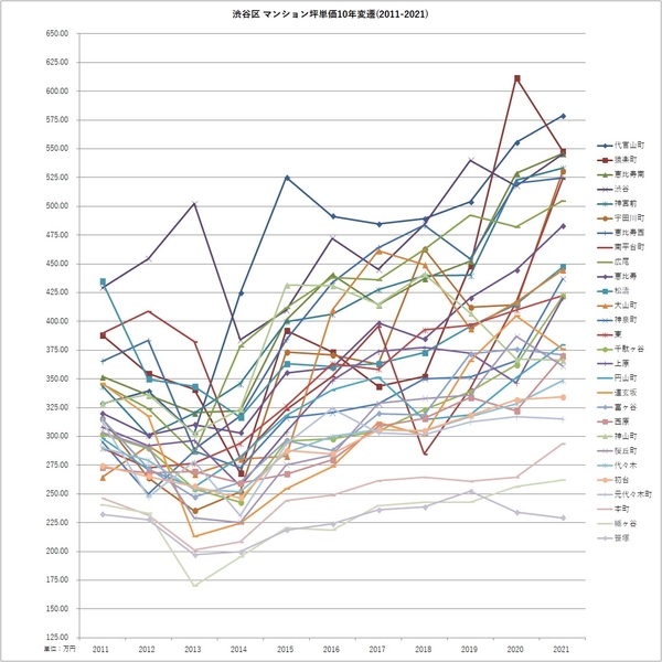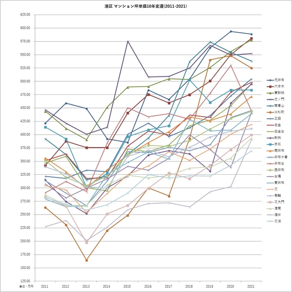 2011年と2021年のマンション坪単価より騰落率を算出。
