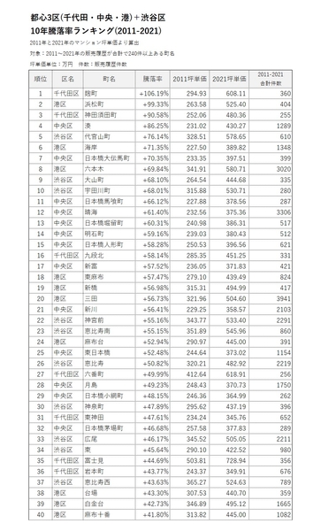 ■都心3区(千代田・中央・港)+渋谷区 10年騰落率ランキング(2011-2021)