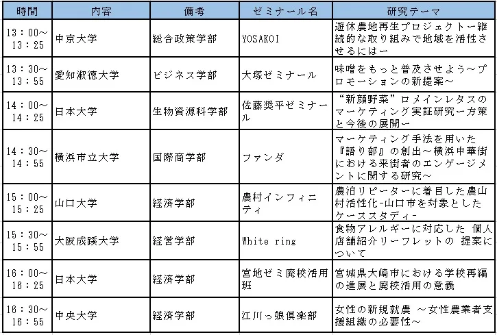 今大会は、18大学から学術的分野34チーム、実践的分野17チームの計51チームが参加しています。予選は、11月1日から8日までの間に、各チームが提出したプレゼン動画を審査する形式で行われ、決勝へは学術的分野の予選上位8チーム、実践的研究分野の同4チームが出場します。決勝の結果は、翌日にアグコン公式サイトにて発表いたします。
