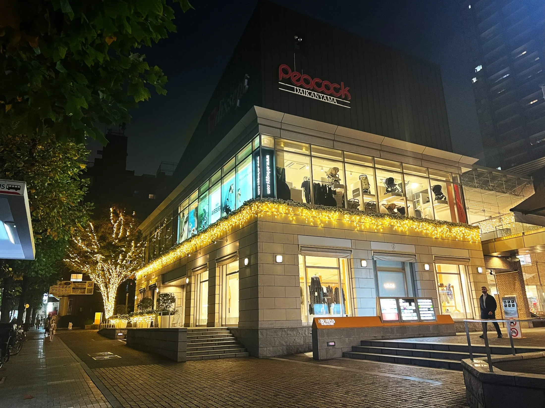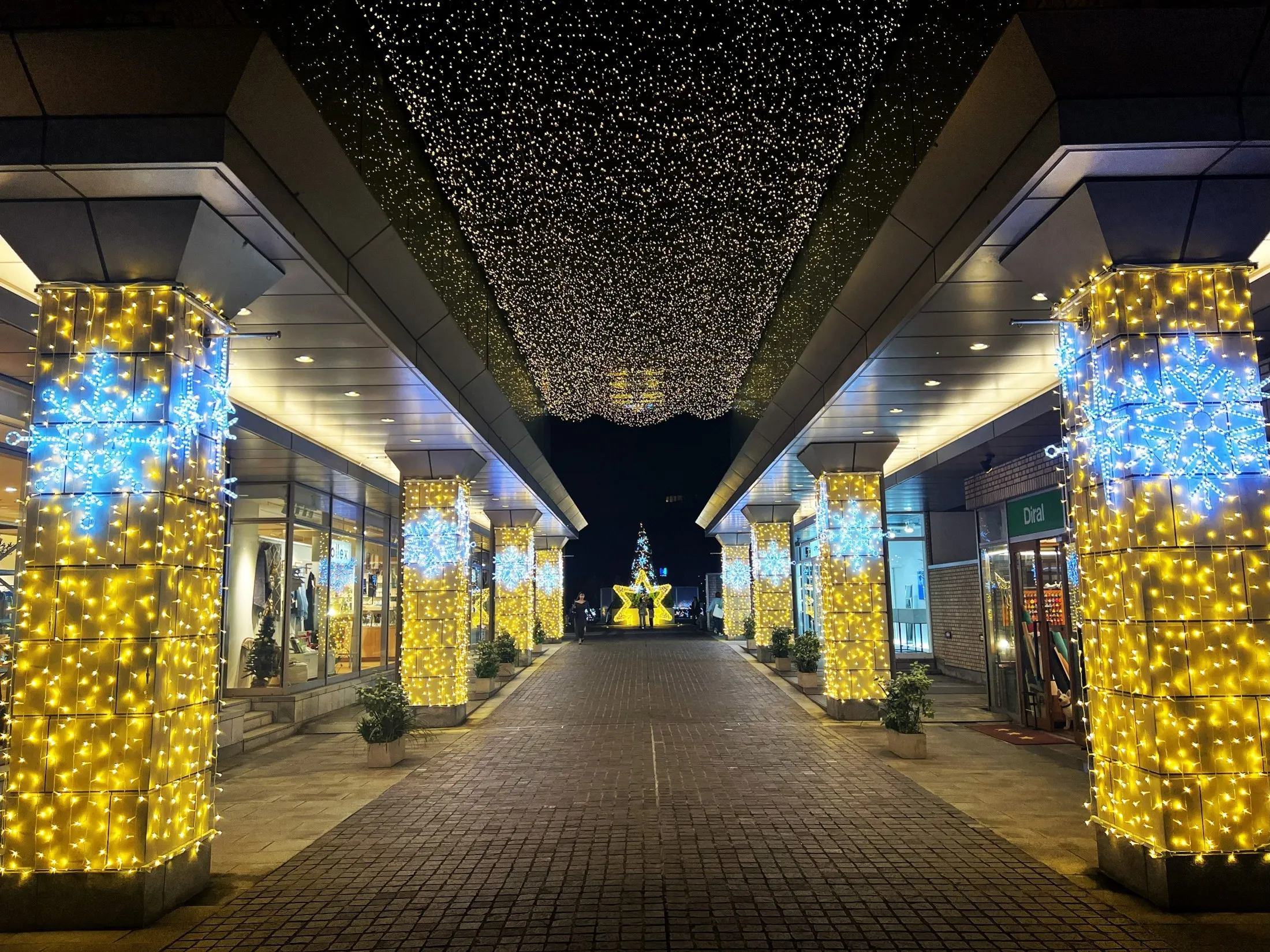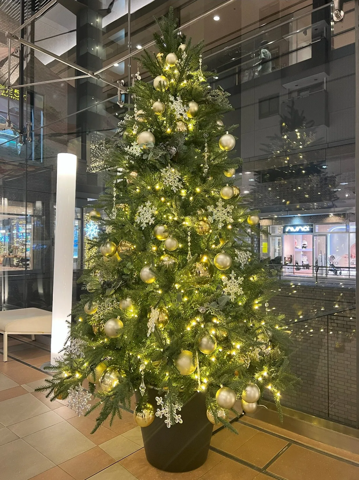 アドレスプラザのメインツリーと連動したシャンパンゴールドのイルミネーションが輝く中、スターオーナメントのホワイトカラーが際立ちます。