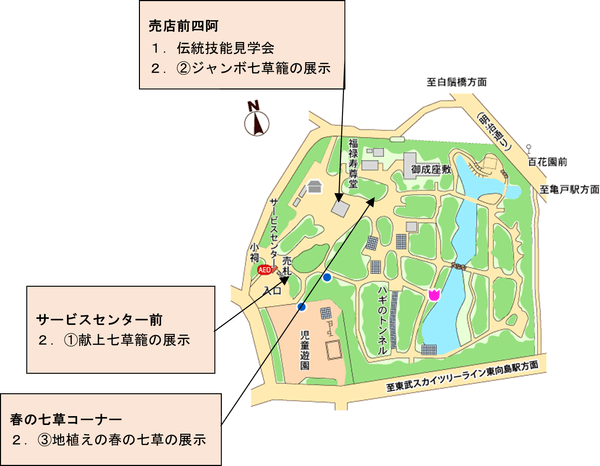 今年も向島百花園職員による七草籠制作の実演をご覧いただく見学会と、「献上七草籠」や直径約50cm、高さ約1mの「ジャンボ七草籠」、「地植えの春の七草」等の展示を行います。