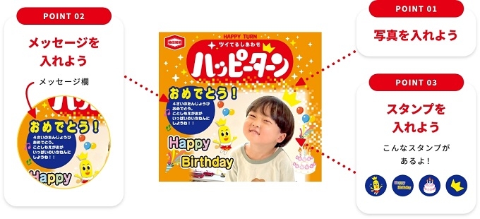 『オリジナルハッピーターン』は、お好きな写真とメッセージを入れて自分だけのパッケージを作成できるサービスです。お誕生日、結婚式といったハレの日はもちろん、部活動や文化祭といったスクールイベントの思い出作りにもぴったりです。特別な想いを届けられる『オリジナルハッピーターン』は、様々なシーンで喜ばれること間違いなしの世界にひとつだけのオリジナルギフトです。