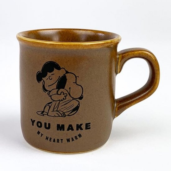味わいのある飴色のカップに、スヌーピーがウッドストックをギュっとしているデザインがとってもかわいいマグカップです。