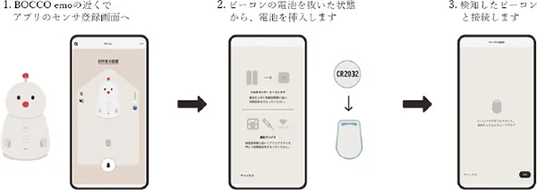 このたびの連携により、ビーコンを持ったお子様や高齢者などがBOCCO emoに近づくと、専用アプリをインストールしたご家族のスマートフォンにビーコンを検知したことを通知するとともに、あらかじめ設定した「おかえり」などのメッセージがBOCCO emo本体から発話されます。