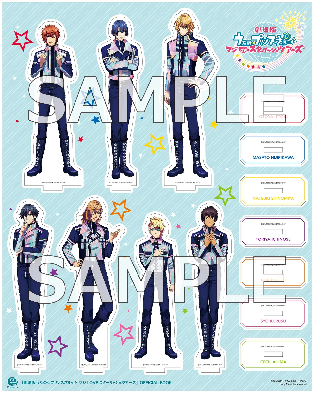 なお、今回はST☆RISH7名の描きおろし表紙イラストを使用した完全数量限定のアクリルスタンド付きセットも同時販売。プレート仕様となっており、7体それぞれに台座がついているので、独立して好きな場所に飾ったり、持ち歩くことができる。「劇場版 うたの☆プリンスさまっ♪ マジLOVEスターリッシュツアーズ」での“宇宙服スタイル”の新規描きおろし立ち絵イラストを使用したマストバイアイテムで、法人別特典としてL版ブロマイドも付いてくる。