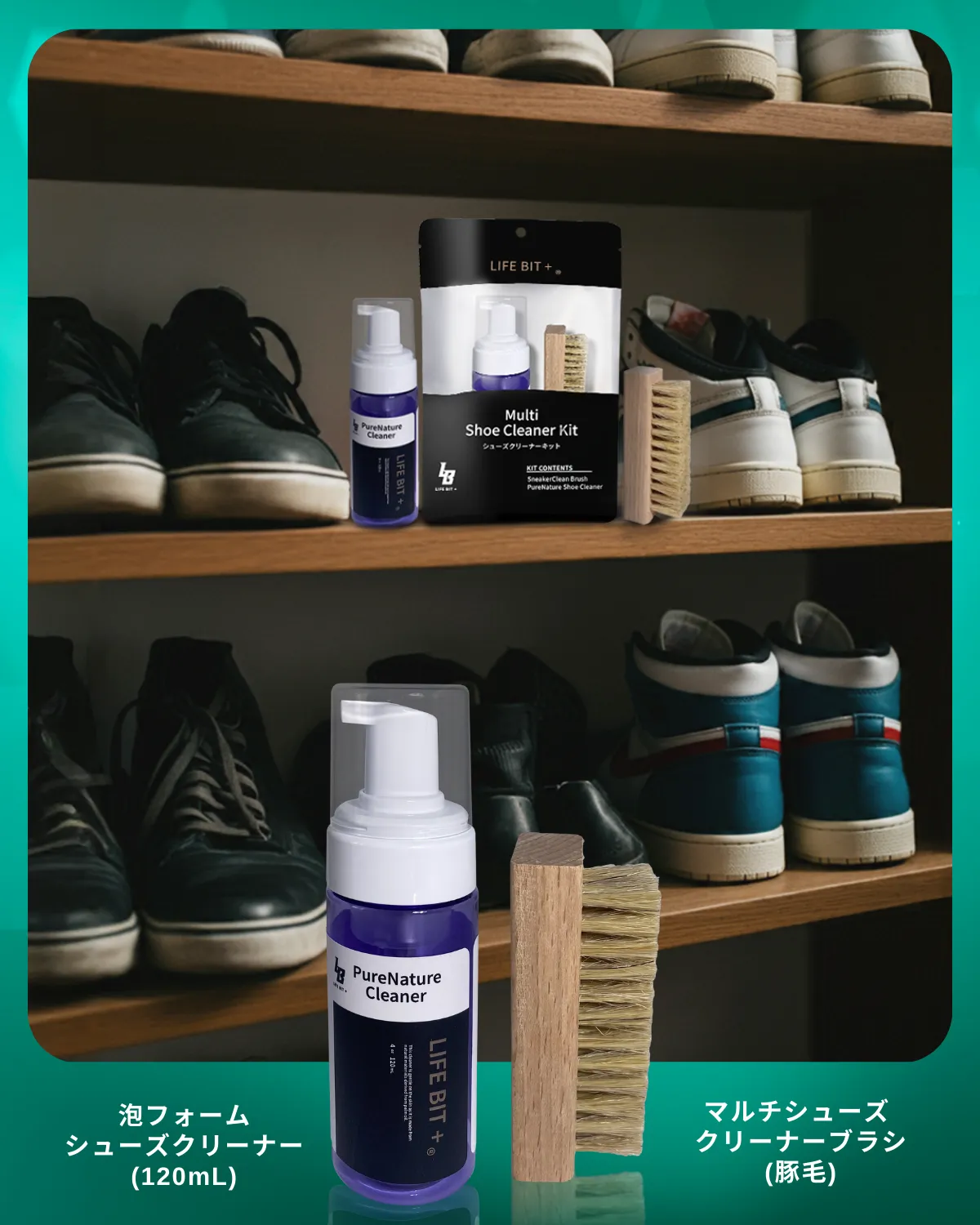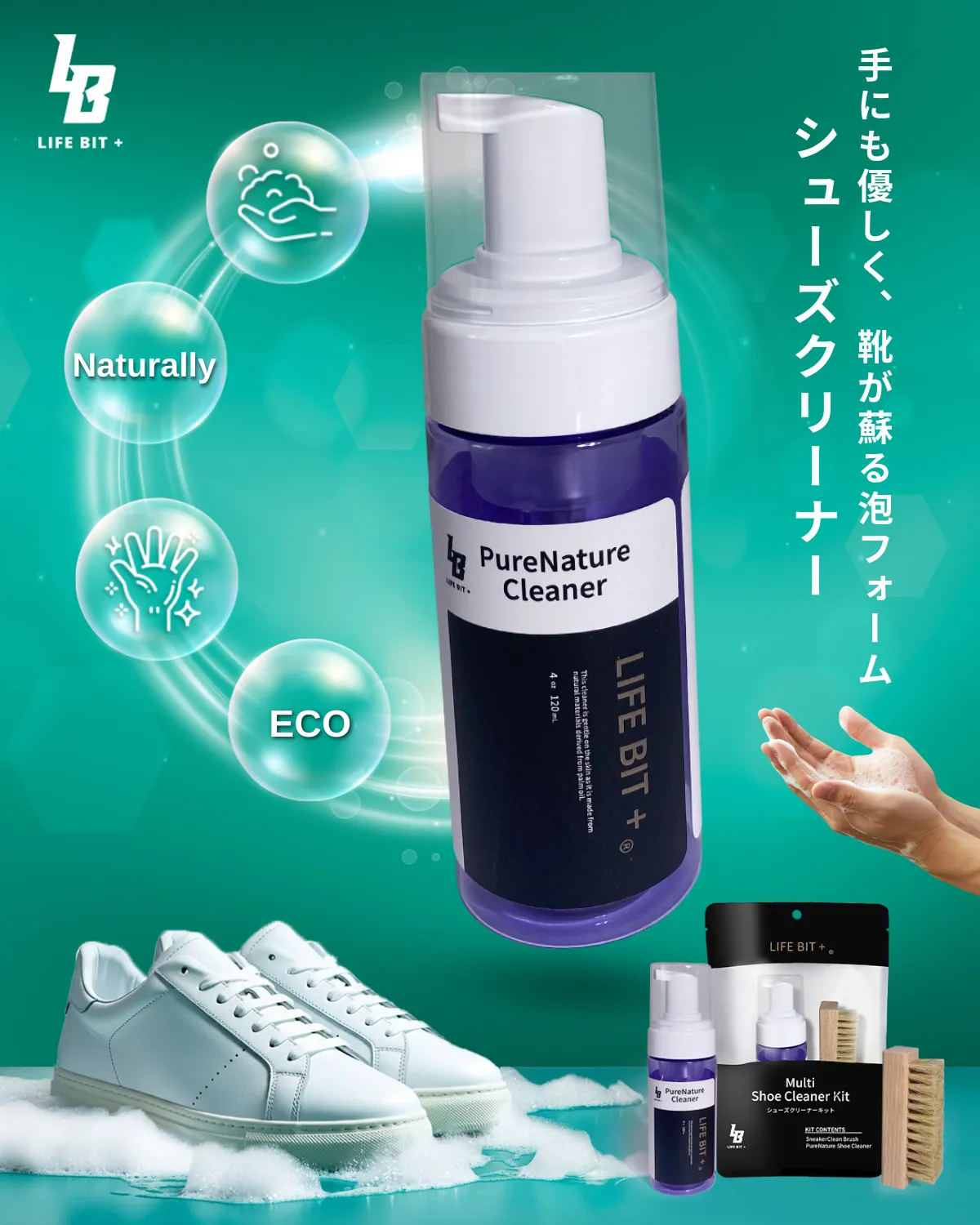 LIFEBIT+シューズクリーナーは、ヤシ油由来の泡フォームがシューズを包み込み、優しく汚れを取り除きます。泡が汚れに馴染み、軽く擦るだけでクリアな輝きを取り戻すその使用感は、革靴やスニーカーを愛する方々にふさわしいアイテムです。
