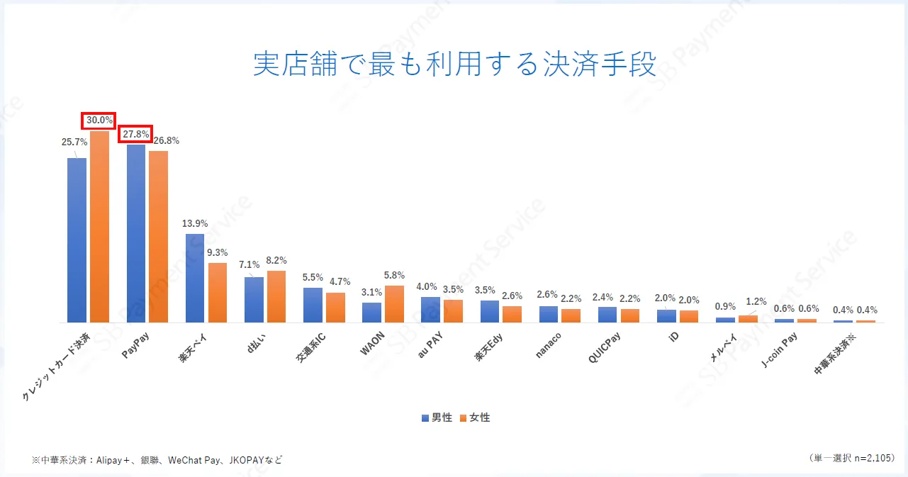 さらに、実店舗で最も利用する決済手段について尋ねたところ、男性は1位が「PayPay」(27.8%)、2位が「クレジットカード決済」(25.7%)、女性は1位が「クレジットカード決済」(30.0%)、2位が「PayPay」(26.8%)と男女で分かれる結果になりました。男女ともに3位は「楽天ペイ」(9%以上)、4位は「d払い」(7%以上)とQRコード決済に根強い人気があることが分かります。