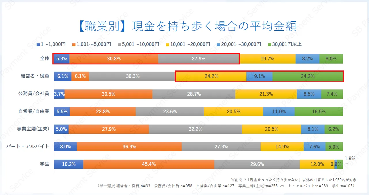また、1日に持ち歩いている現金の平均金額を尋ねたところ、職業別で見ると経営者・役員は1万1円以上が57.5%ではあるものの、全体では1万円以下と回答した人が64.0%でした。日本でもキャッシュレス決済が浸透してきたことで、高額の現金を持ち歩く必要がなくなってきていることが想定されます。