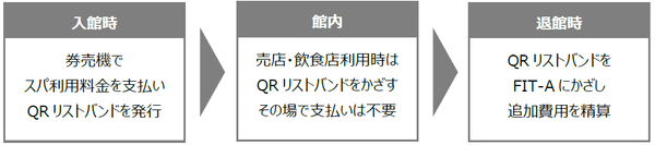 今回の導入では、スパ利用者で追加費用が発生した場合、退館時QRリストバンドを『FIT-A』にかざして精算します※2。