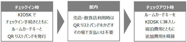 今回の導入では、『KIOSK』にてチェックイン手続きを行う際、ルームカードキーの発行に加えQRリストバンドの発行と夕朝食時間の選択、ホテルの館内インフォメーションを表示する機能を追加しました。