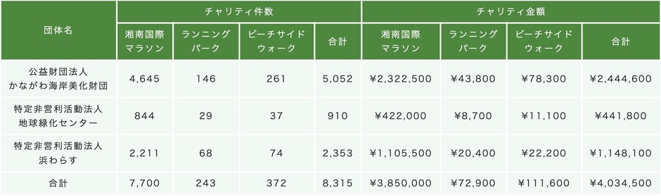 本大会の趣旨である「地球環境活動」を支える3つの団体を支援するため、チャリティへのご協力をお願いしましたところ、8,315名の皆様より総額4,034,500円ものご寄付を賜りました。