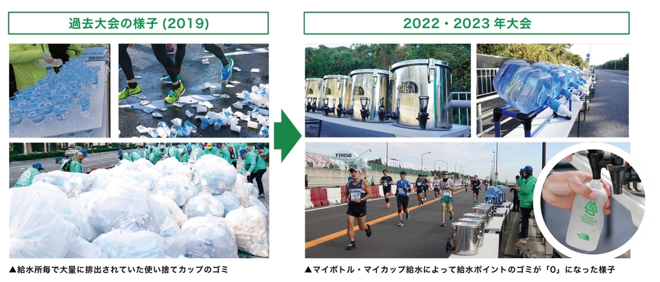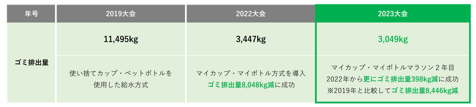2022年、世界初となる “ゴミを出さないマラソン大会”を目指して大幅リニューアルしてから今年で3年目となる本大会。それまでは給水において約50万個の紙コップ・プラカップを使い捨て、約31,500本のペットボトルを使用し、ゴミの総量は11,495kgでしたが、昨年はゴミの総量が3,049kgとなり、8,048kg削減に成功。