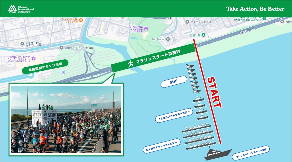 湘南といえばやはり海!そこで本イベントではマラソンスタート9時の号砲に合わせて約18,000人のランナーと一緒に「6人乗りアウトリガーカヌー」「1人乗りアウトリガーカヌー」「サップ」もスタートします。