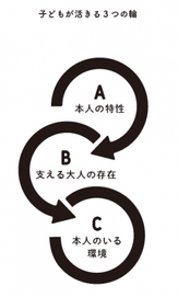子どもは1人ひとり個性があって違います。これが「A 本人の特性」です。また子どもには、安心でき、「B 支える大人の存在」が必要になります。最後に子どもの特性を理解し、しっかり支えてくれる大人の存在のもとで、子ども自身がさまざまなことにチャレンジできる「C 本人のいる環境」があってはじめて、子どもは自分の力を発揮できるのです。