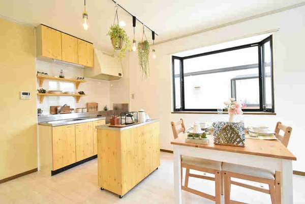 当物件においては「ナチュラルテイスト」に特化したリノベーションを行っているので、室内には無垢材を使用したおしゃれなナチュラルキッチンを始め、温かみを感じられる漆喰、そしてダウンライト&ペンダントライトが設置されていることから、自宅にいながらいつでも気軽に「おうちカフェ」を楽しむことができます。