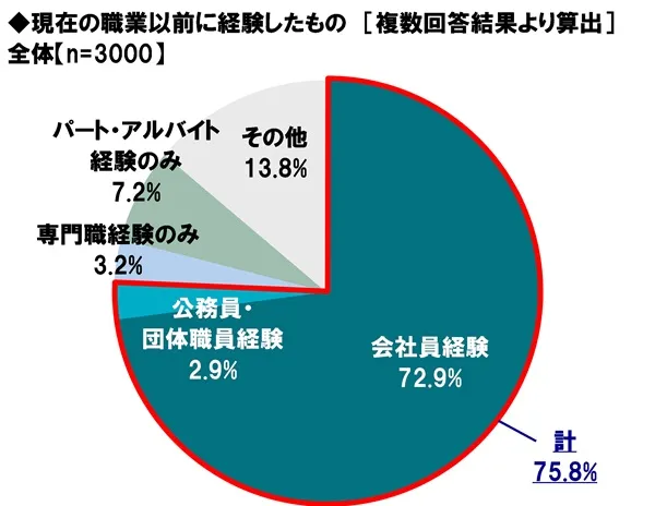 まず、現在の職業以前に経験したものを聞いたところ、「会社員経験」が72.9%で突出して高くなり、「公務員・団体職員経験(会社員経験はなし)」が2.9%、「専門職経験のみ」が3.2%、「パート・アルバイト経験のみ」が7.2%、「その他」が13.8%となりました。「会社員経験」と「公務員・団体職員経験(会社員経験はなし)」の合計は75.8%となり、大多数の人が雇用されて働いた経験を有していることが分かりました。