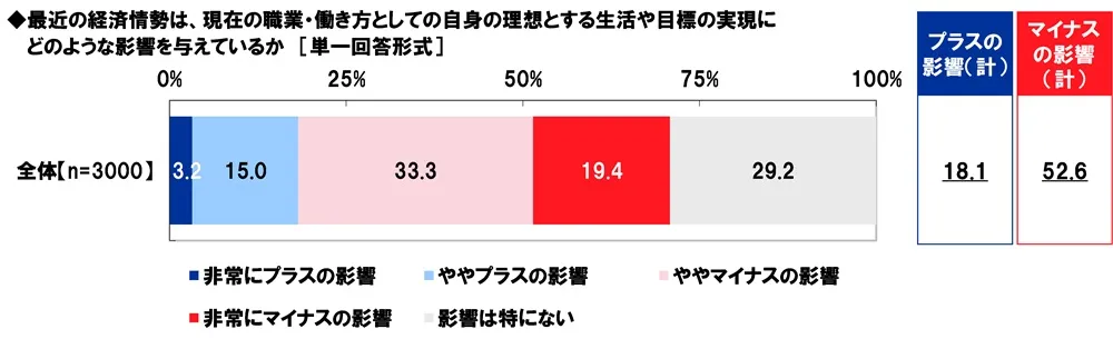 全回答者(3,000名)に、最近の経済情勢が、現在の職業・働き方としての自身の理想とする生活や目標の実現にどのような影響を与えているか聞いたところ、「非常にプラスの影響」、「ややプラスの影響」を合計した『プラスの影響(計)』は18.1%、「非常にマイナスの影響」、「ややマイナスの影響」を合計した『マイナスの影響(計)』は52.6%、「影響は特にない」が29.2%となりました。急激な円安の進行や相次ぐ物価上昇など不安定な経済情勢が、理想の生活や目標の実現に対し悪影響を及ぼしているケースが多いと考えられます。