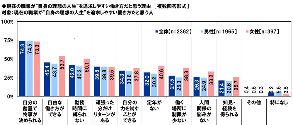現在の職業が“自身の理想の人生”を追求しやすい働き方だと思う人(2,362名)に、その理由を聞いたところ、「自分の裁量で物事が決められる」(74.3%)が突出して高くなりました。次に高い理由は、「自由な働き方ができる」(45.4%)、「勤務時間に縛られない」(42.0%)、「頑張った分だけリターンがある」(39.8%)、「自分の力を試すことができる」(34.3%)でした。
