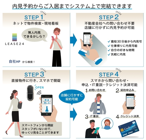STEP1物件検索→STEP2webから内見予約→STEP3直接現地に行き、スマホから開錠→STEP4契約