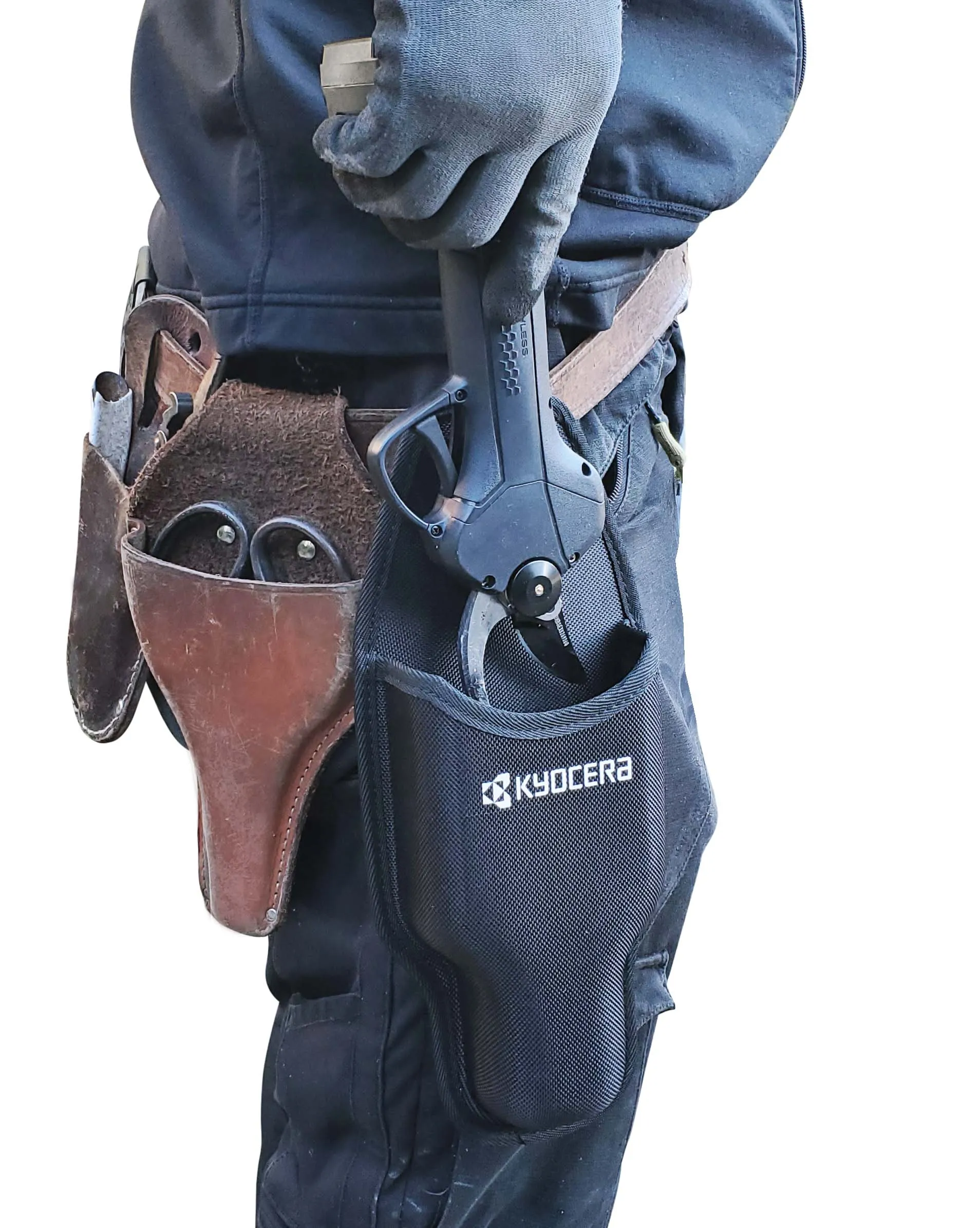 剪定作業時に便利なホルスターを標準付属しています。刃を開いた状態でも収納可能です。