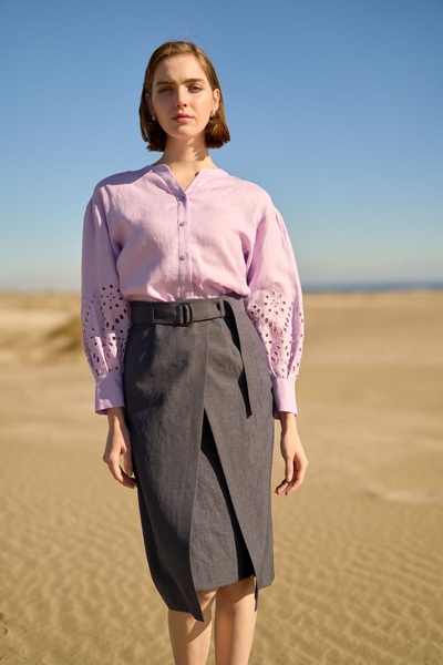 第二弾となる春のヴィジュアルLOOKでは、華やかなフラワーレース刺繍の袖デザインが特徴的な麻素材のブラウス、トレンドの凹凸感のあるサッカーストライプ素材のセットアップ、大人の抜け感のあるワンピーススタイルなどが登場。