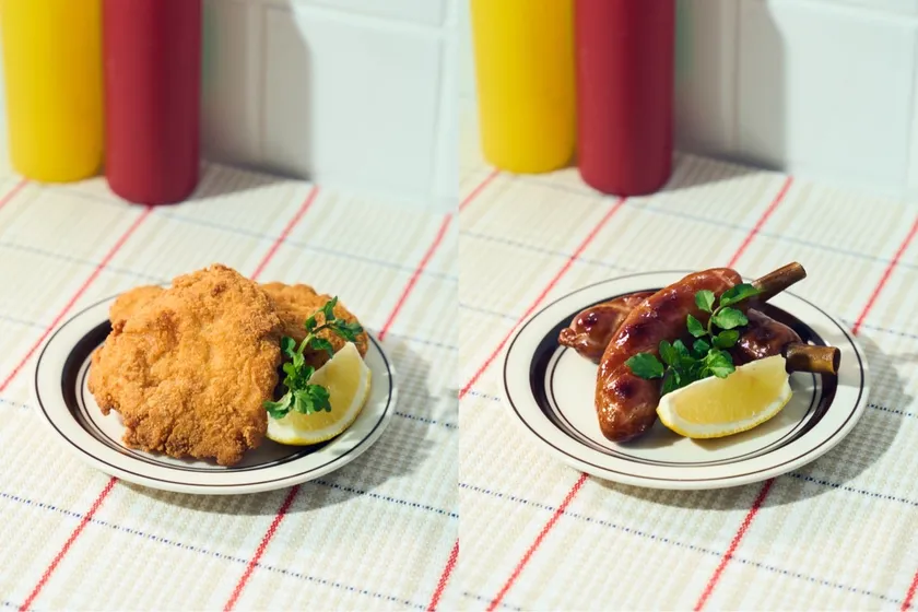 (左)フライドチキン/2P、(右)骨付きソーセージ/2P
