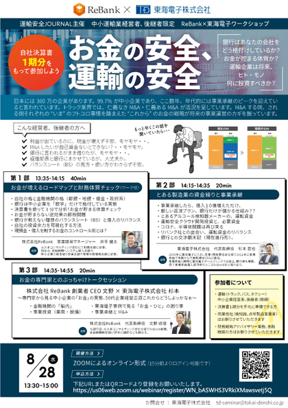 【中小運輸業経営者・後継者限定】ReBank✕東海電子ワークショップ「お金の安全、運輸の安全」8月28日(水) 無料開催のお知らせ