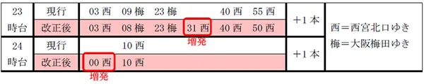 ・大阪梅田発西宮北口ゆき急行を13本増発します。