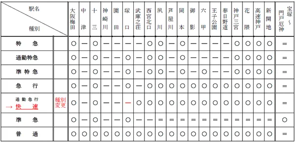 ◆ 通勤急行の停車駅のうち塚口を通過に改め、列車種別を新設の快速に変更します。