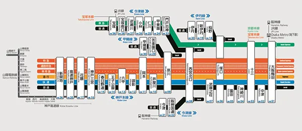 ・神戸線 快速停車駅…大阪梅田・十三・武庫之荘~新開地の各駅