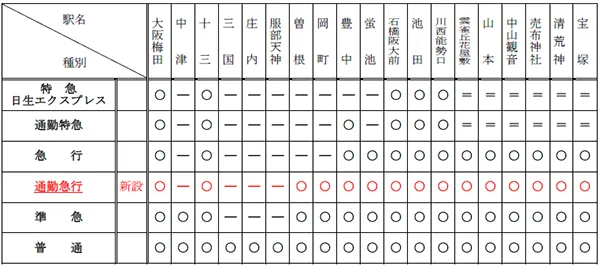 ・曽根・岡町に停車することで、両駅の利便性が向上します。なお、大阪梅田から宝塚までの所要時分は現行と変わりません。