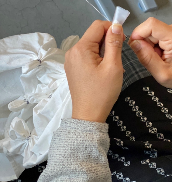 400年を超える歴史を持つ、愛知県の伝統工芸「有松絞り」の職人さんの、繊細な手仕事に魅力を感じました。大量生産はできず、1点1点染める温もりのある手仕事が、ONIGIRI の目指す”肩の凝らないリラックスした暮らし”に、とても近いものを感じ、ファッションでも生かしたいと考えました。そこで、通常、浴衣や暖簾などで使われてきた染めの技術を、カジュアルアイテムに取り入れたとき、柄が一番きれいに見えるアッパッパを商品化しました。