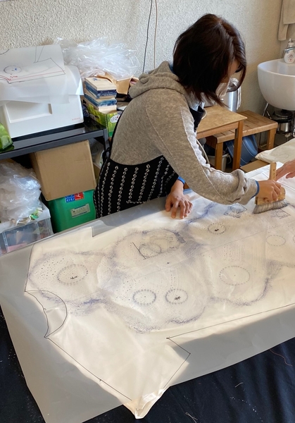シンプルなワンピースに、愛知県名古屋市にある㈱山上商店協力のもと「帽子絞り」という技法を使い、モダンなドット柄を表現しました。