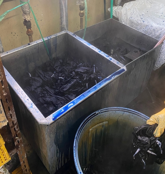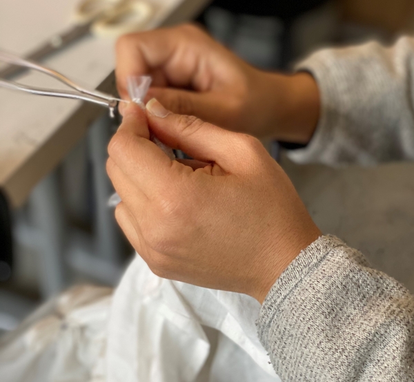 合計2回の染色を行いますが、白のドット柄はしっかりと防染して、染料が付かないようにします。水色の部分は、1回のみ染料に漬けて薄い藍色にしています。ドット柄以外の部分は、しっかりと染料に漬け、染めならではの美しい藍色が特徴です。プリントでは出ない、色の味わいやドット柄のナチュラルな風合い、1点1点の異なった表情が魅力です。
