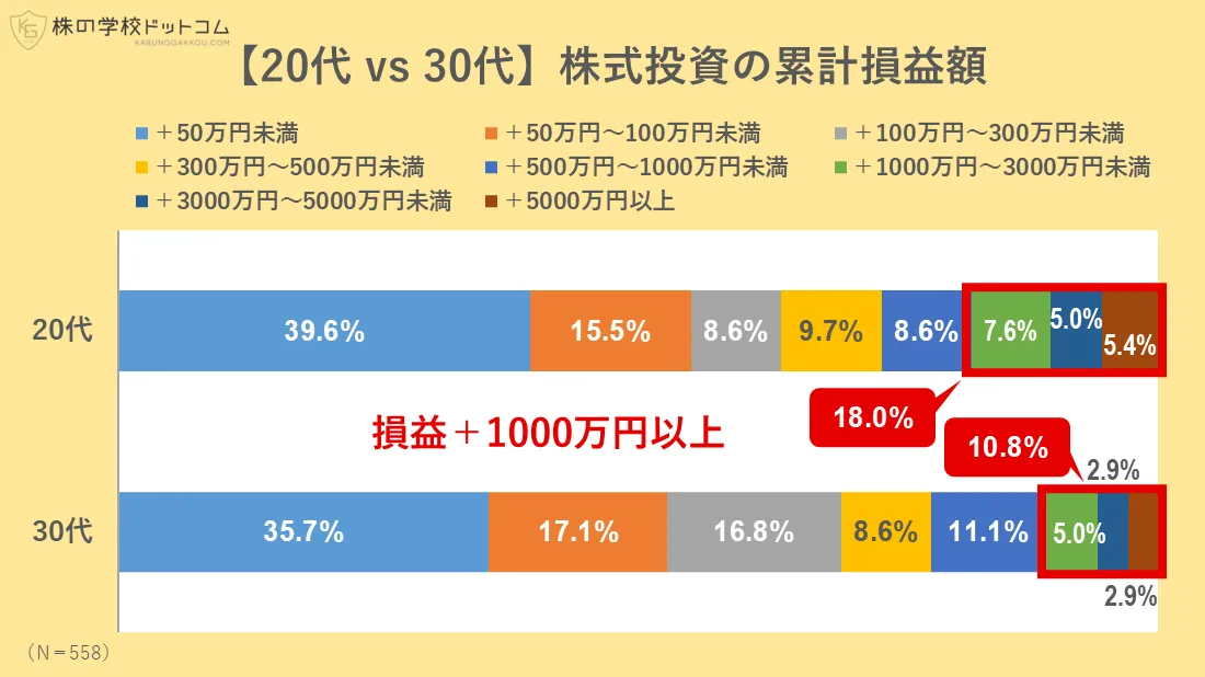 損益プラスと回答した人にその額を聞いたところ、最も回答が多かったのは、どちらの世代も「+50万円未満」で、20代が39.6%、30代は35.7%でした。+300万円以上と回答した人の割合を見てみると、20代が36.3%なのに対し、30代はそれよりも少ない30.4%。+1000万円以上で比較しても、20代の18.0%に対して、30代では10.8%でした。