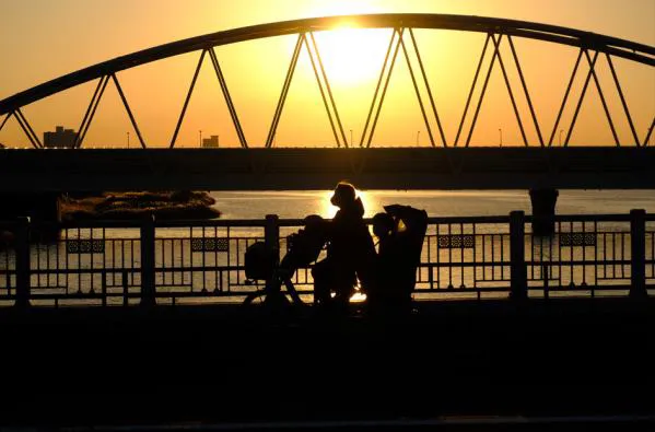十三大橋の夕景です。自転車の前と後ろに二人の子供さんをのせたお母さんが力強くペダルをこいでいます。沈む夕日が三人の姿をくっきりと浮かび上がらせてくれました。さあ今夜の夕食のメニューは何にしましょうか!