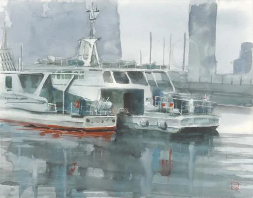 船尾と船舷が影を落とす水面の描写に魅かれます。粗い描写の建物を背景にして、この水面は素描感のある筆致とwet on wetによる柔らかなにじみ効果で動きのある前景の舞台を作っています。全体の構成も良く帰港後の休息という題材の雰囲気が出ていてとても魅力的な作品です。(井上 正三先生)