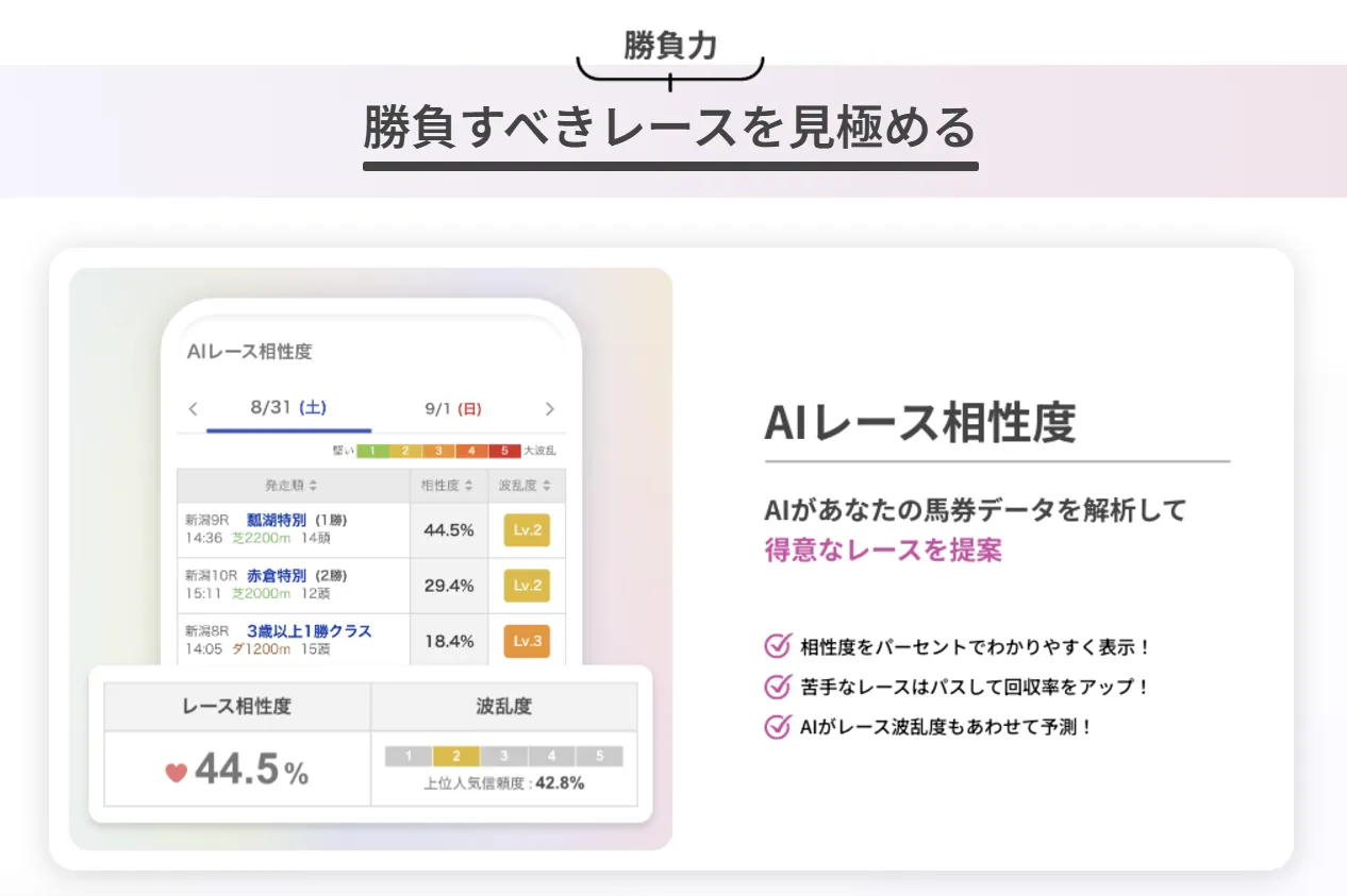 自身の馬券データをAIが分析し、得意・不得意レースを指標化した「AIレース相性度」や、競馬ファンのメモを集計し堅いレースや荒れるレースがひと目でわかる「みんなのラベル」など、負けるレースには手を出さず勝てるレースでしっかり勝負できるためのサポートを実現します。