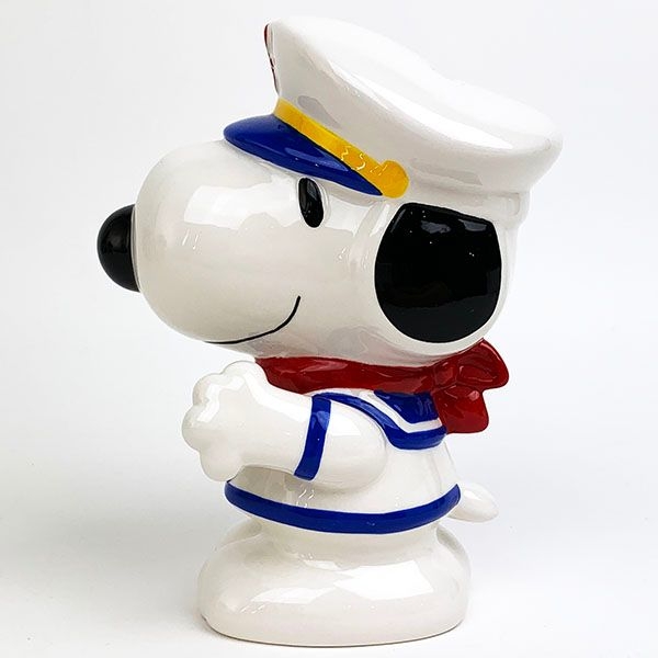マリンスタイルのスヌーピーがとってもキュートな貯金箱です。帽子までかぶっていて、本格的なマリンテイスト!片手を出しているポーズも決まっていますね。サイズは160×90×130mmです。インテリアとしても最適なサイズですね♪
