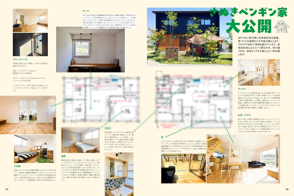 特集1の実例紹介では、家族それぞれがほっと一息つける、そんな居場所が見つけられる三軒の住まい手にインタビュー。特集2では、家づくりの過程からその後の暮らしまで、ブログやSNSで情報発信を続ける「さぬきペンギン」さんと、建築概要から建築費、7年間の暮らしをデータで検証していきます。