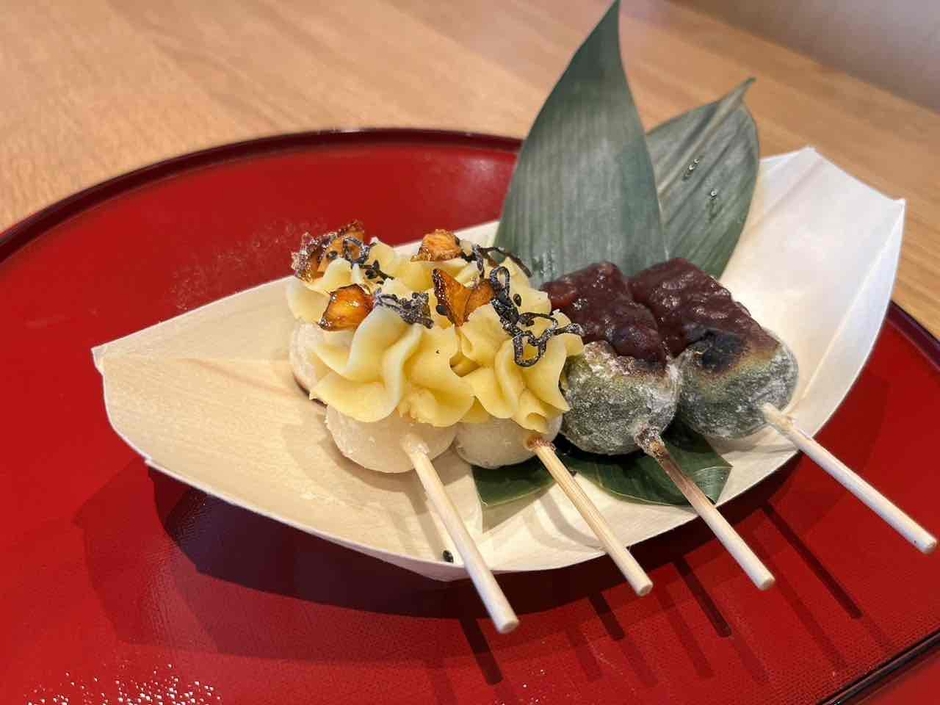 この度の新商品は、福井県あわら市の富津地区にて栽培された甘味が強いサツマイモ「富津金時」のペーストをお団子にお客様ご自身にたっぷり乗せていただく一品で、塩昆布、キャラメリゼした富津金時がアクセントになった何本でも食べたくなるお団子です。