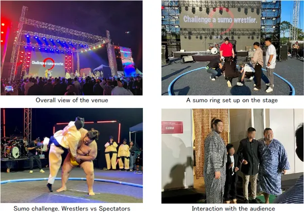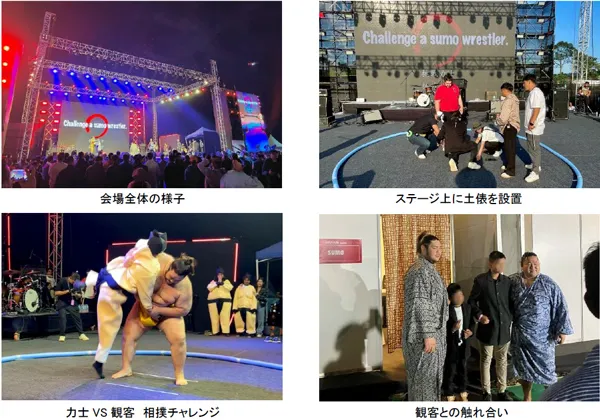 約30分間にわたる公演では、相撲の基本的なルールや技をコミカルに紹介し、力士による迫力満点の取組を3番披露した後、観客が実際に相撲を体験できる「相撲チャレンジ」を実施しました。この体験は、会場から選ばれた3名の参加者が、相撲スーツを着てステージに上がり力士に挑戦するもので、会場内は終始歓声に包まれ、大変な盛り上がりを見せました。公演終了後には、観客が力士に記念撮影を求めるなど、会場外にも人だかりができるほどの熱気に包まれました。