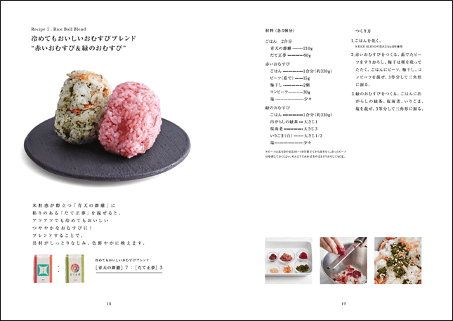 例えばおにぎりの場合、アツアツでも冷めても美味しいことはもちろん、お米の粒感がきちんと感じられ、具材とお米をしっとりとなじませることが調理の際の重要なポイントとなります。そこで、米粒感が際立つ「晴天の霹靂」と、粘り気のある「だて正夢」を、7:3の配合で混ぜて炊くことで、アツアツでも冷めてもおいしく、具材の美味しさも際立たった、つややかなおむすびが完成します。レシピブックでは、料理の作り方だけでなく、お米をブレンドする方法や、お米を美味しく炊くコツも記載しています。冊子の内容を参考にして、今までの料理とはひと味ちがうお米の体験を是非味わってみてください。