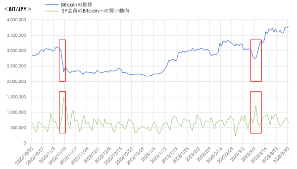 下記は2022年10月20日から2023年3月30日までのBitcoinの推移とSP会員のBitcoinへの買い動向を示したグラフです。