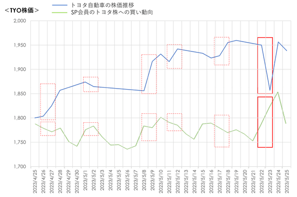 5月23日の急落は、24日の朝には値を戻していましたが、それを知らずに朝方ニュースを見たSP会員が、大急ぎでトヨタ自動車株を買いに走っている行動が、グラフからも見えてきそうです!