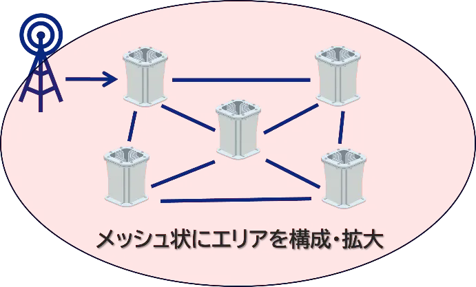 本技術は、受信したミリ波基地局の電波の中継網を、中継器自体が自律的に形成し、ミリ波エリアを効率的に拡張する特長を備えています。本技術を搭載した中継器は、相互に連携してメッシュ状につながり、ミリ波エリアの拡張が可能になります。