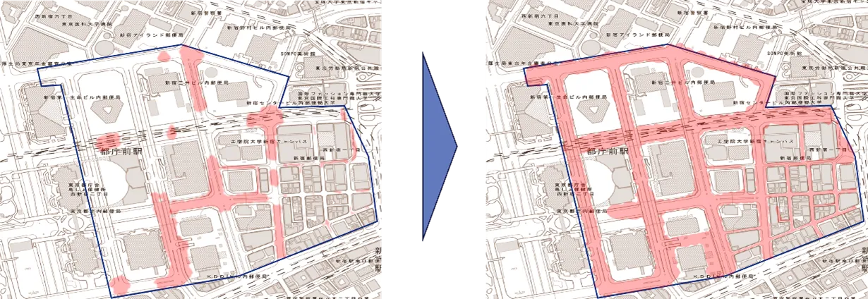 本技術のフィールドでの性能確認を目的に、東京都が推進する「つながる東京」展開方針(注2)の下、東京都と新宿区が保有する街路灯および地下出入口などに、合計22台の中継器を設置しました。本試験は2024年10月から実施し、西新宿地区の約600メートル四方の範囲において、既存のミリ波のカバー率と比較し、道路のカバー率を33%から99%に拡大したことを確認しました。