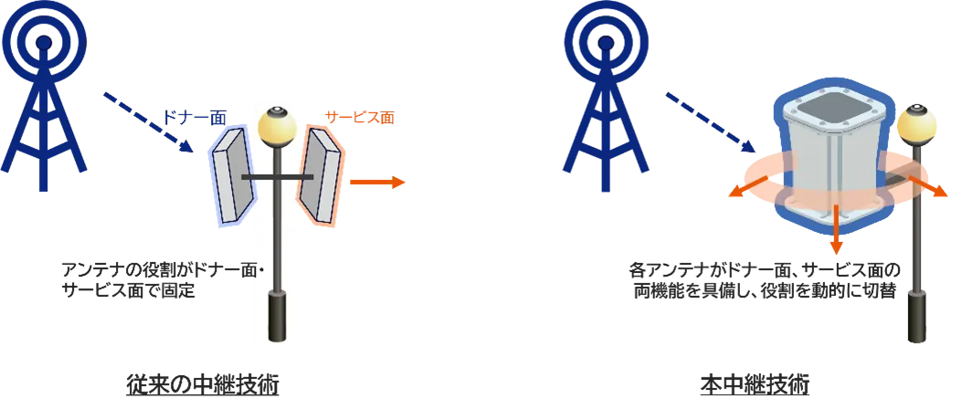 従来の中継技術では、基地局から受信するアンテナをドナー面、増幅して送信するアンテナをサービス面と役割を決める中継方法が一般的であり、エリアを構築する上では、基地局に対して各アンテナの役割と指向方向を調整する必要がありました。これに対し、本中継器では、各アンテナでドナー面とサービス面の両機能を具備し、ミリ波基地局から受信したアンテナ面をドナー面として、その他アンテナをサービス面として動的に切り替えることで、ミリ波エリアの自律的なエリア形成と効率的なエリア拡張を実現します。これにより、本中継器同士が網目のようにつながり、メッシュ状にエリア構築を可能とします。
